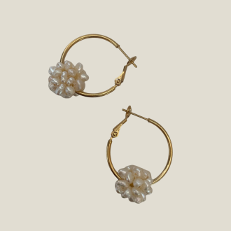 Matériaux : Créoles, laiton doré mat à l'or fin combinée avec un assemblage de perles d’eau douce nommées "Keshi" *terme japonais qui désigne une perle non nucléée produite accidentellement dans une huître perlière lorsqu'elle rejette le noyau implanté. Les keshis sont généralement de petite taille et peuvent avoir une forme irrégulière. Leur couleur et leur lustre dépendent des facteurs environnementaux et des conditions dans lesquelles l'huître a été cultivée. Ces perles peuvent présenter une grande variété de couleurs et de nuances, et elles sont souvent appréciées pour leur caractère unique et leur beauté naturelle.